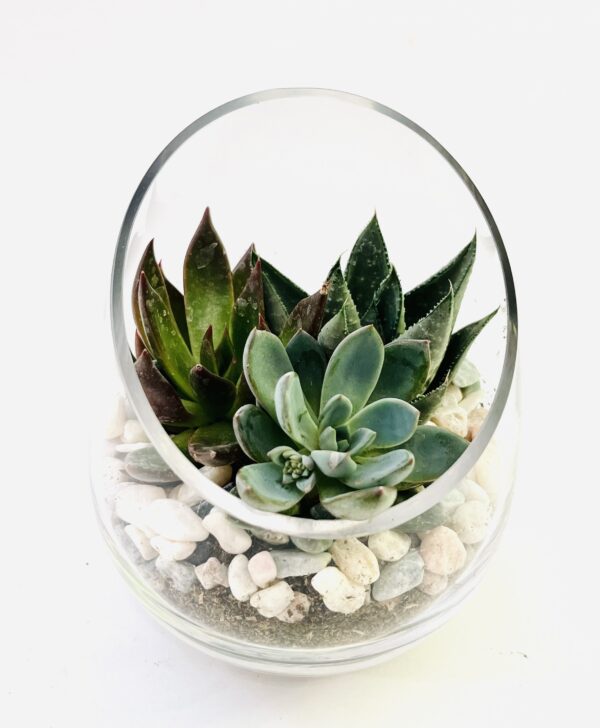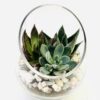 The “Hello Summer” plant features a vibrant mix of hardy succulents arranged in a sleek, modern glass container. These low-maintenance plants thrive with minimal care, making them perfect for adding a touch of greenery to your space. With their unique shapes and rich textures, these succulents bring a fresh, summery vibe to any room.