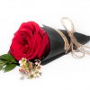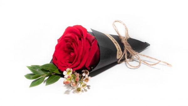 One fragrant Rose accented with Myrtle and Waxflowers. Delightfully wrapped with a meaningful label: “Especially for You”.