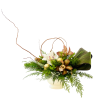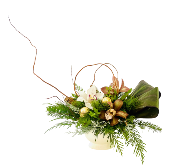 A charming and modern Christmas arrangement designed in a vintage-style gravy bowl. Elegant orchid blooms take center stage, surrounded by lush winter greens that add texture, fragrance, and festive warmth. Soft seasonal accents create a gentle holiday glow, making this piece perfect for a cozy table centerpiece, a unique hostess gift, or a special touch of Christmas charm in any home.